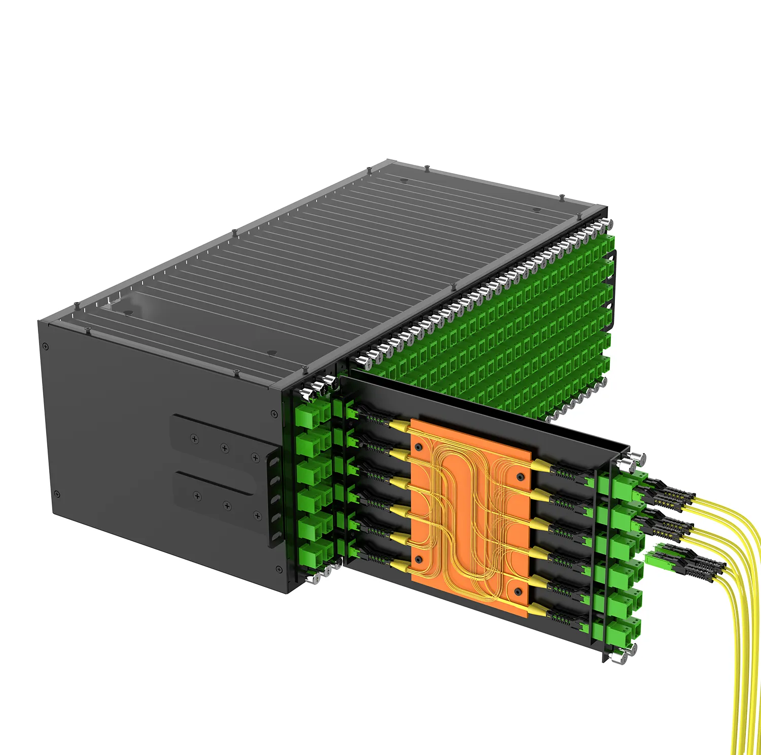 Modern hyper-scale data centers demand ultra-high-speed parallel optical connections, but traditional spine-leaf architectures create cabling complexity—each leaf switch must connect to every spine switch, leading to tangled fiber bundles and inefficient layouts. T&S’s 4U Shuffle Enclosure with FOFC (Fiber Optic Flex Circuit) Technology overcomes this challenge in a revolutionary way.