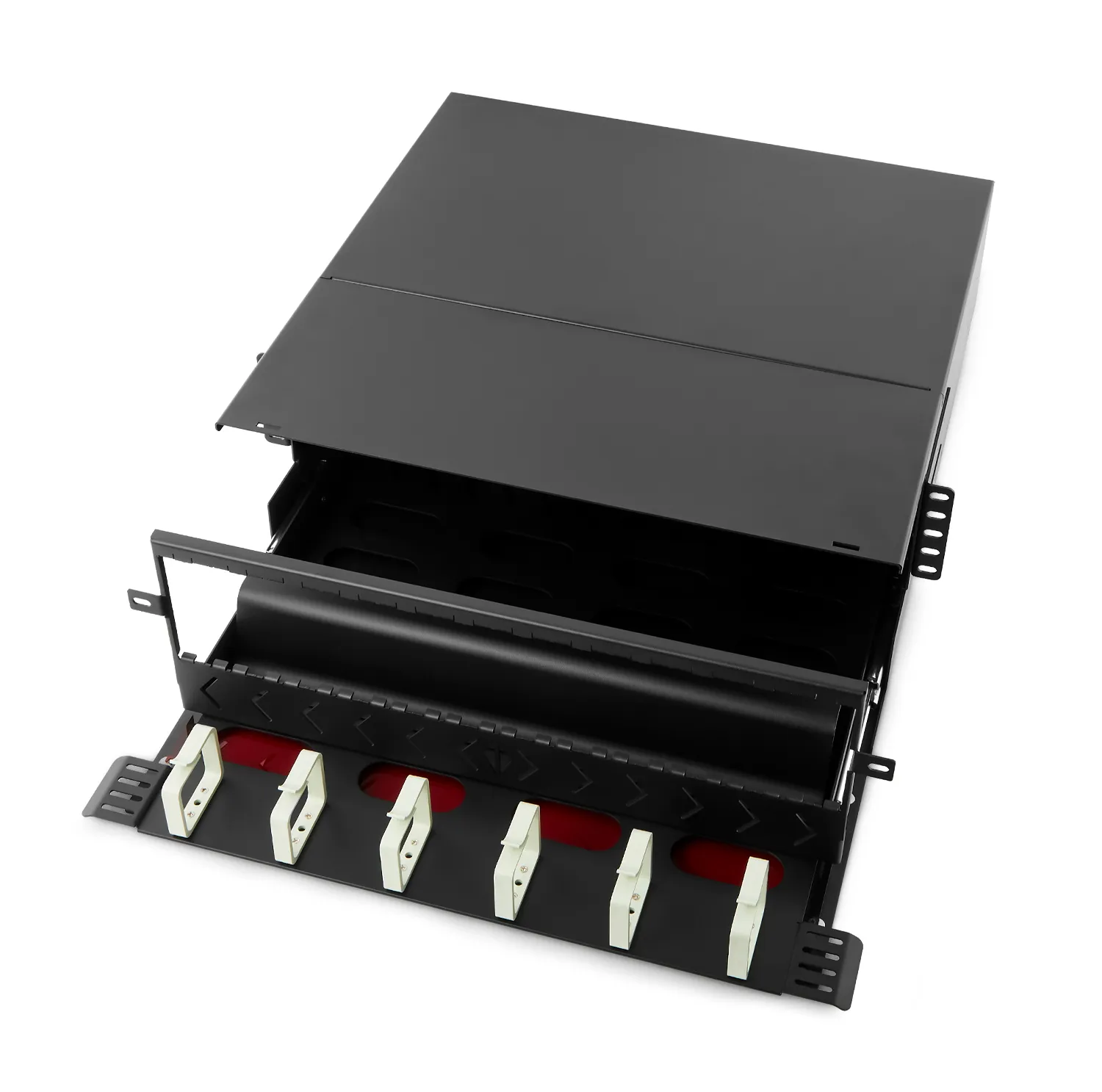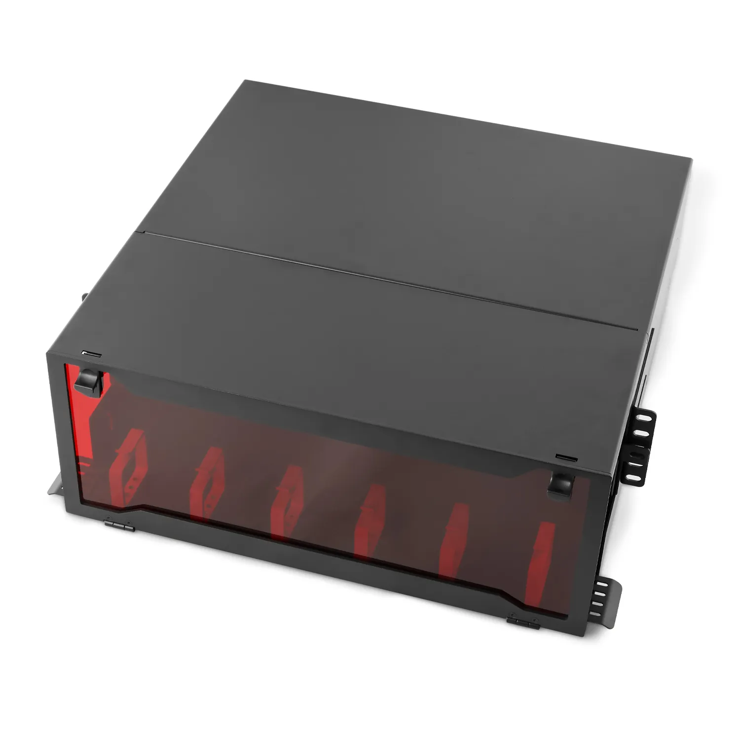 The T&S UltraM 4U Rack Mount Fiber Enclosure (Sliding Enclosed Type) is engineered to accommodate up to 12 module cassettes or fiber adapter panels from the Ultra family, providing a versatile solution for various fiber optic patching and termination requirements. Its sliding tray enables convenient front access to fiber connections.